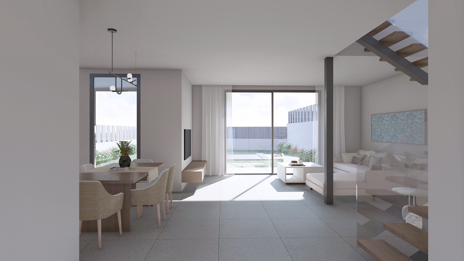 The exterior of the properties is designed to offer privacy and a high level of comfort. Each property has its own outdoor parking space for two cars, as well as a private swimming pool and a private garden. The homes have a large terrace on the solarium floor, which allows for open views of the sea. The exterior design blends in perfectly with the natural surroundings, standing out for its harmony with the urban Mediterranean style.