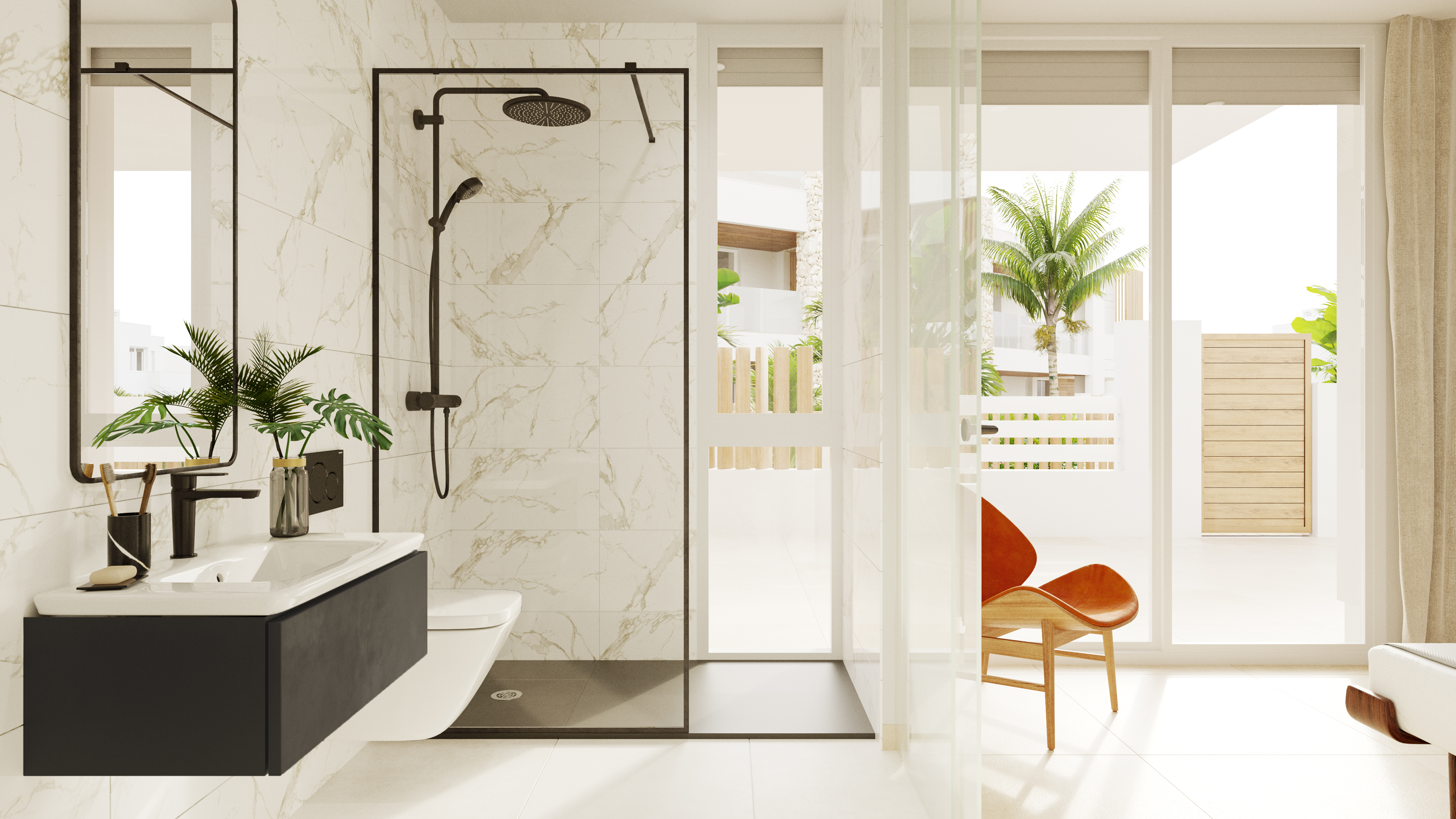The outdoor spaces of these homes in San Juan de los Terreros are designed to maximize enjoyment of the Mediterranean climate. Each property offers a private garden, perfect for creating a personal green space to relax or enjoy outdoor activities. Additionally, the terraces provide an ideal place to enjoy the views and fresh air, becoming an additional space for leisure and entertainment. The inclusion of a solarium in each home allows residents to make the most of the sun throughout the year, offering an exclusive space for sunbathing or simply enjoying the panoramic views of the surroundings.